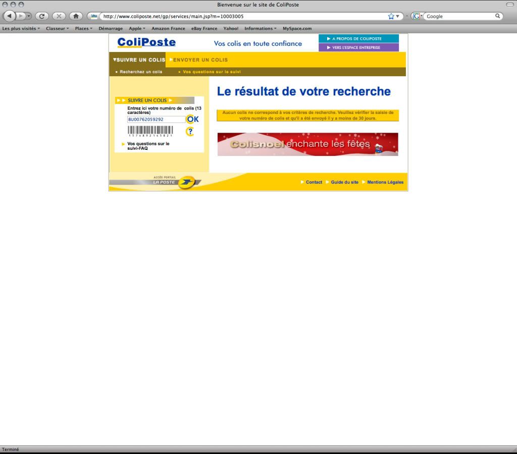 Suite à notre conversation téléphonique, et afin d’évité tout point d’ombre, veuillez trouver ci joint la preuve que votre numéro de colis ne correspond à aucun colis envoyé.